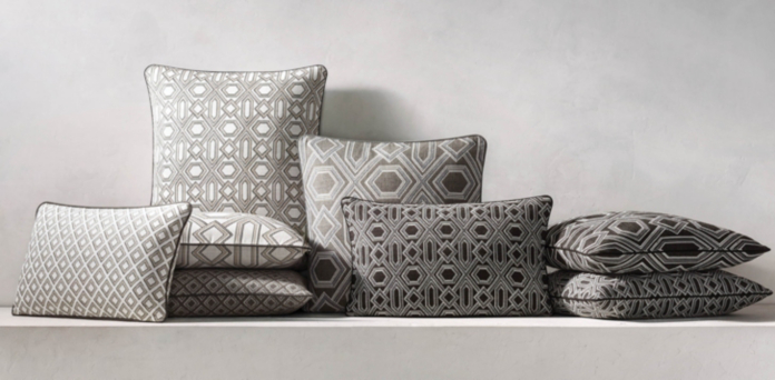 Grey and white geometric indoor/outdoor deep seating cushion, corded.